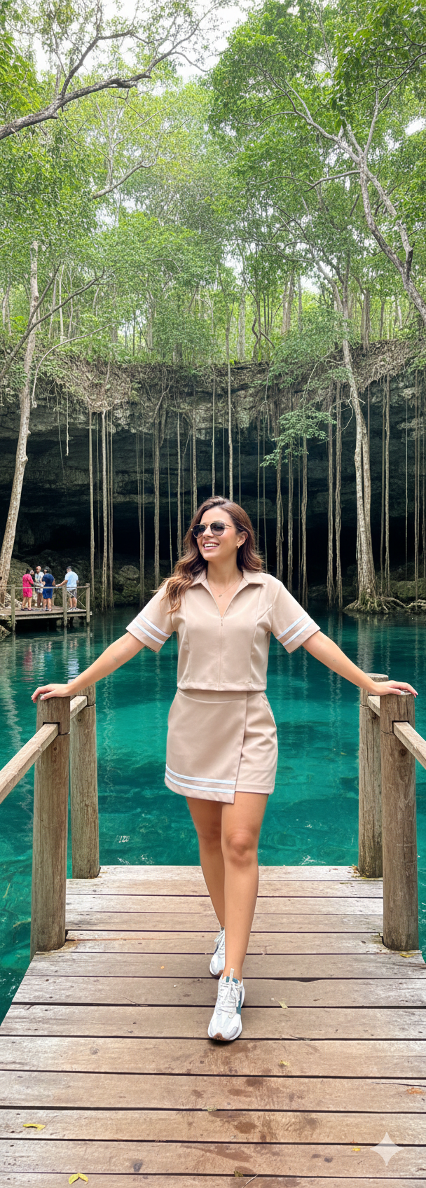 La blusa tipo polo con cierre frontal sutil y el short de tiro alto con bolsillos crean una horma favorecedora que estiliza y resalta tus piernas.
